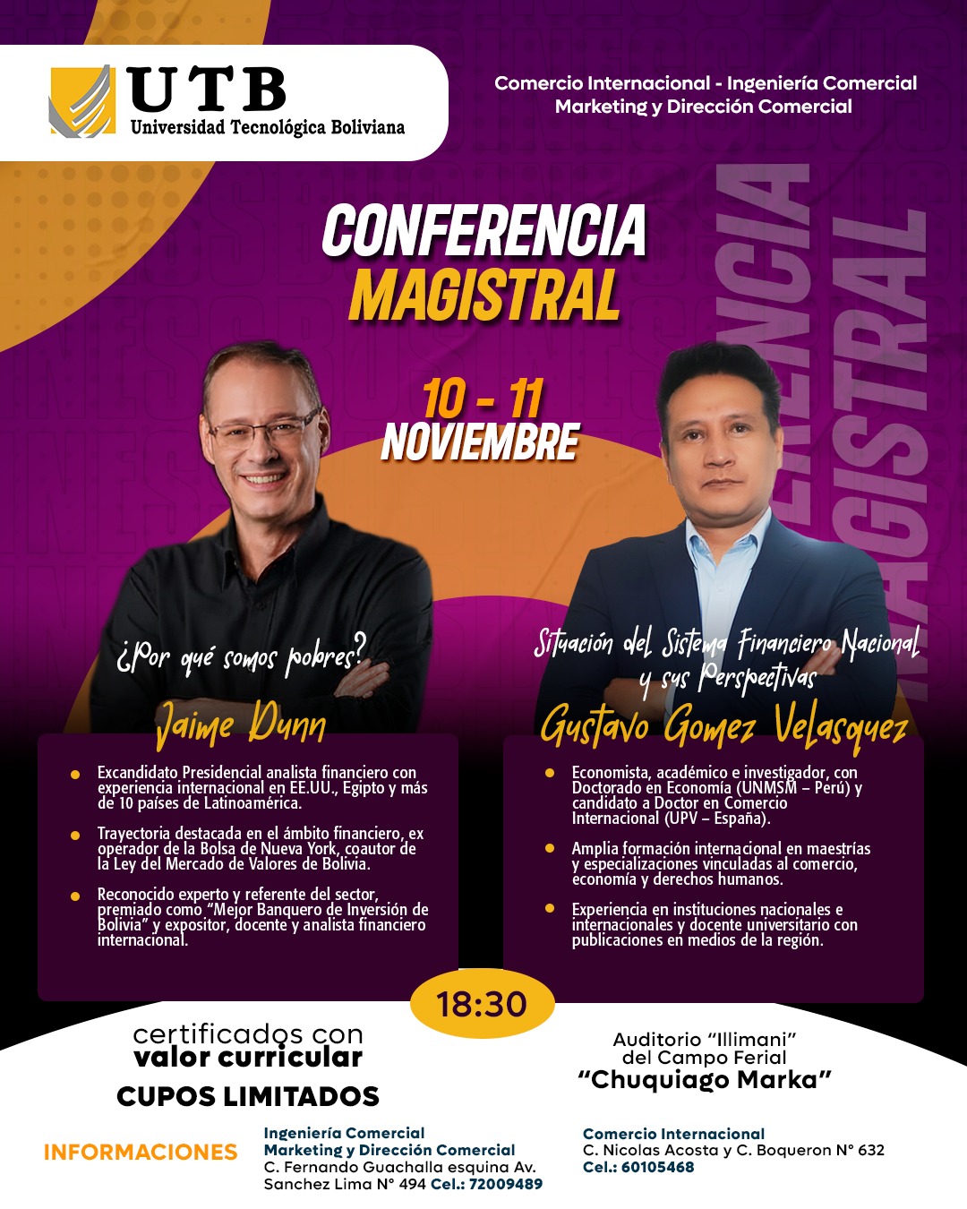 Este 10 y 11 de noviembre, te esperamos en la Conferencia Magistral organizada por las carreras de Comercio Internacional, Ingeniería Comercial, Marketing y Dirección Comercial.