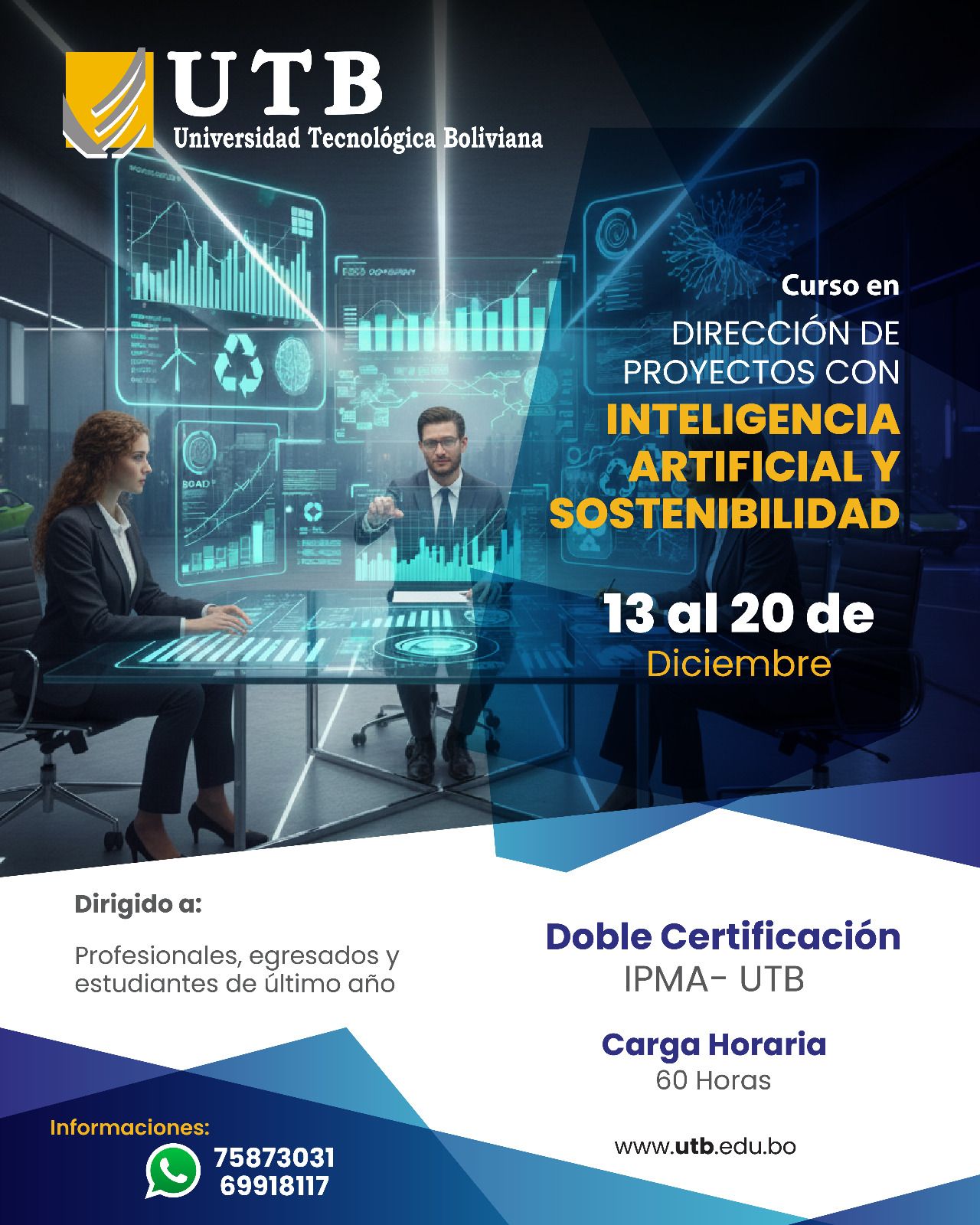 La Universidad Tecnológica Boliviana – UTB te invita a formar parte del Curso en Dirección de Proyectos con Inteligencia Artificial y Sostenibilidad, una capacitación moderna diseñada para responder a los desafíos actuales del entorno empresarial.